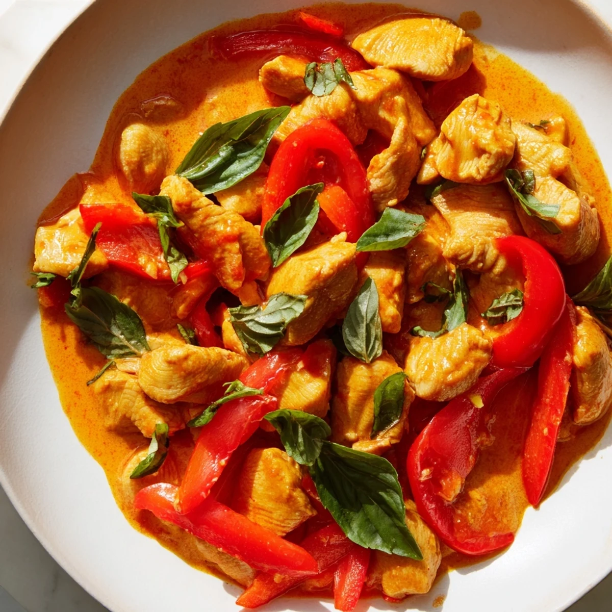 This Thai-inspired dish features tender chicken pieces marinated in soy sauce and cornstarch, then stir-fried to golden perfection. The creamy coconut curry sauce combines red curry paste with aromatics like garlic, ginger, and onion, creating a richly fragrant base. Fresh basil leaves add brightness while lime juice provides tangy balance. The entire dish comes together in just 40 minutes, making it perfect for weeknight dinners yet impressive enough for guests. Serve over steamed jasmine rice to soak up the silky sauce.