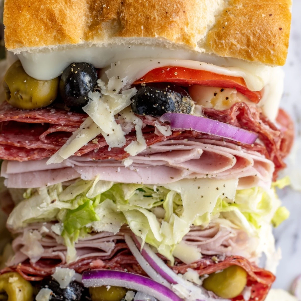 This hearty sandwich combines the best of Italian-American deli tradition with a fresh, vibrant salad twist. Golden crusty rolls get topped with melted provolone and mozzarella cheese, then piled high with classic deli meats including Genoa salami, ham, mortadella, and spicy capicola. The star is the crunchy salad mixture—finely shredded lettuce, red onion, pepperoncini, cherry tomatoes, and black olives—all tossed in a creamy zesty dressing made with mayonnaise, red wine vinegar, and aromatic oregano. Ready in just 20 minutes, these sandwiches are perfect for lunch, dinner, or feeding a hungry crowd.