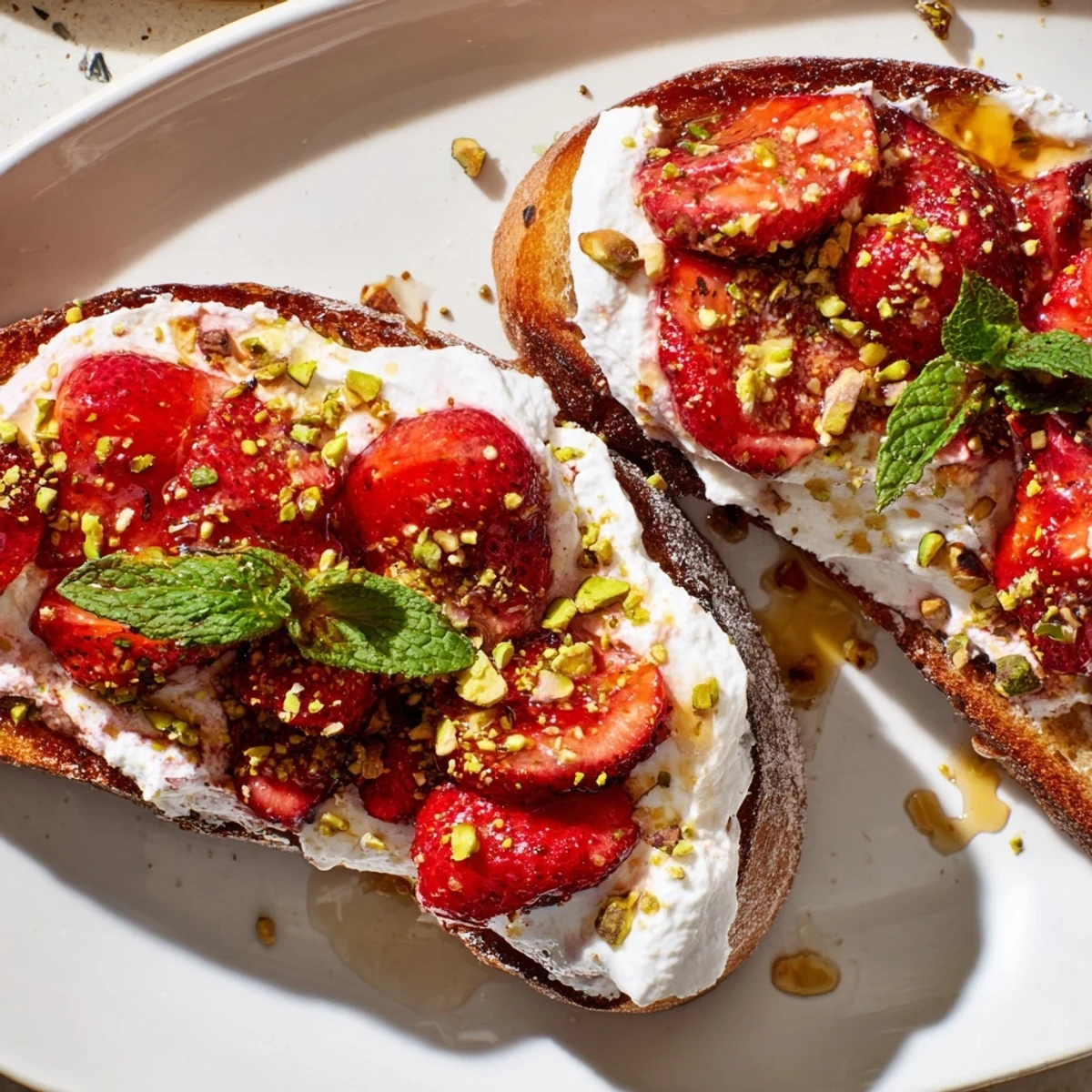 This elegant brunch dish combines airy whipped ricotta with jewel-like roasted strawberries on golden toast. The berries become tender and syrupy after roasting with honey and vanilla, creating the perfect sweet contrast to the tangy, creamy cheese.