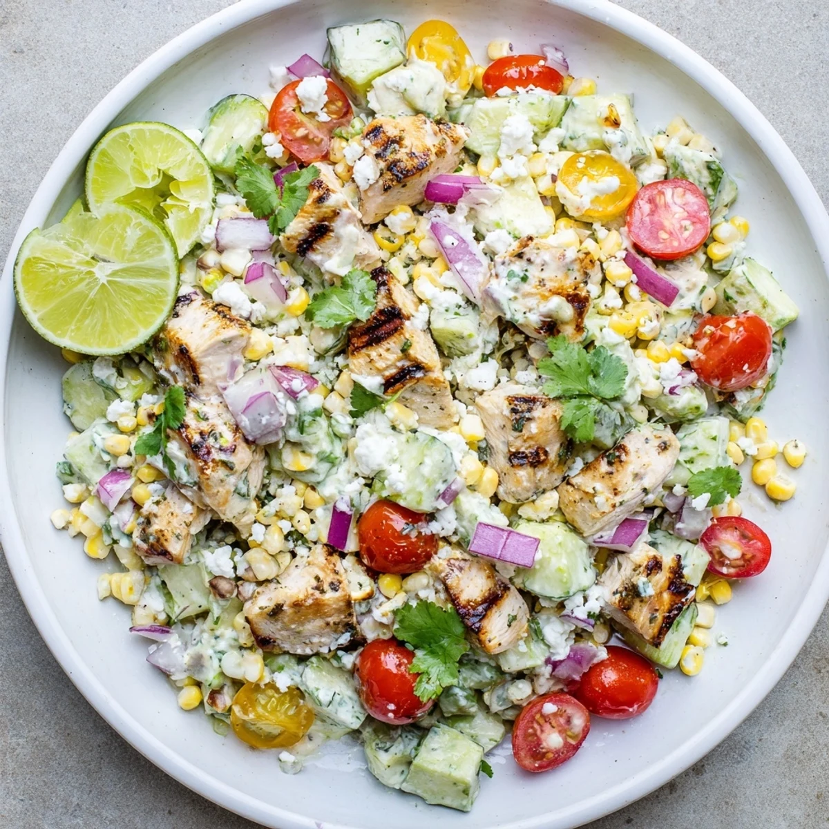 This vibrant salad brings together the best of summer flavors with juicy grilled chicken, crisp English cucumbers, and sweet charred street corn. The creamy dressing combines mayonnaise and sour cream with fresh lime juice, chili powder, and smoked paprika for that signature Tex-Mex kick. Cotija cheese adds a salty finish while fresh cilantro brightens every bite. Ready in just 35 minutes, this gluten-free main dish serves four and works beautifully for meal prep or outdoor gatherings.